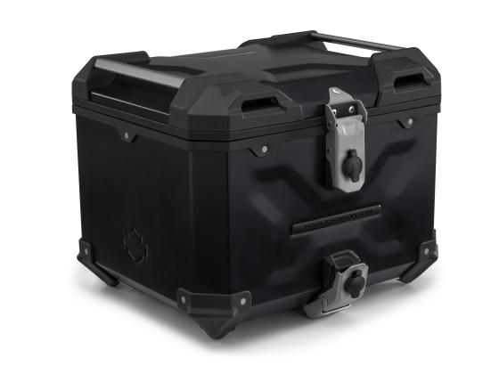 Dieses robuste Aluminium-Topcase wurde in Zusammenarbeit mit SW-MOTECH für den On- und Off-Road-Einsatz entwickelt. Jedes Teil wurde zusammen mit dem Motorrad entwickelt und getestet, um eine werksseitige Passform, Haltbarkeit und Zuverlässigkeit zu gewährleisten, ohne die Handhabung des Motorrads oder den Neigungswinkel zu beeinträchtigen. Sowohl die Koffer als auch die Halterungen haben die statischen Kipptests von Harley-Davidson bestanden. Die schwarz lackierte Oberfläche ist leicht zu reinigen und verhindert Oxidation. Mit einer Dichtung im Deckel ist jedes Teil wasserdicht und besteht einen strengen Harley-Davidson" Wassereindringtest. Die Koffer haben jeweils integrierte Griffe und Bungee-Ösen, und ein einziger Schlüssel schließt jeden Koffer ab und verriegelt den Koffer an seiner Halterung.