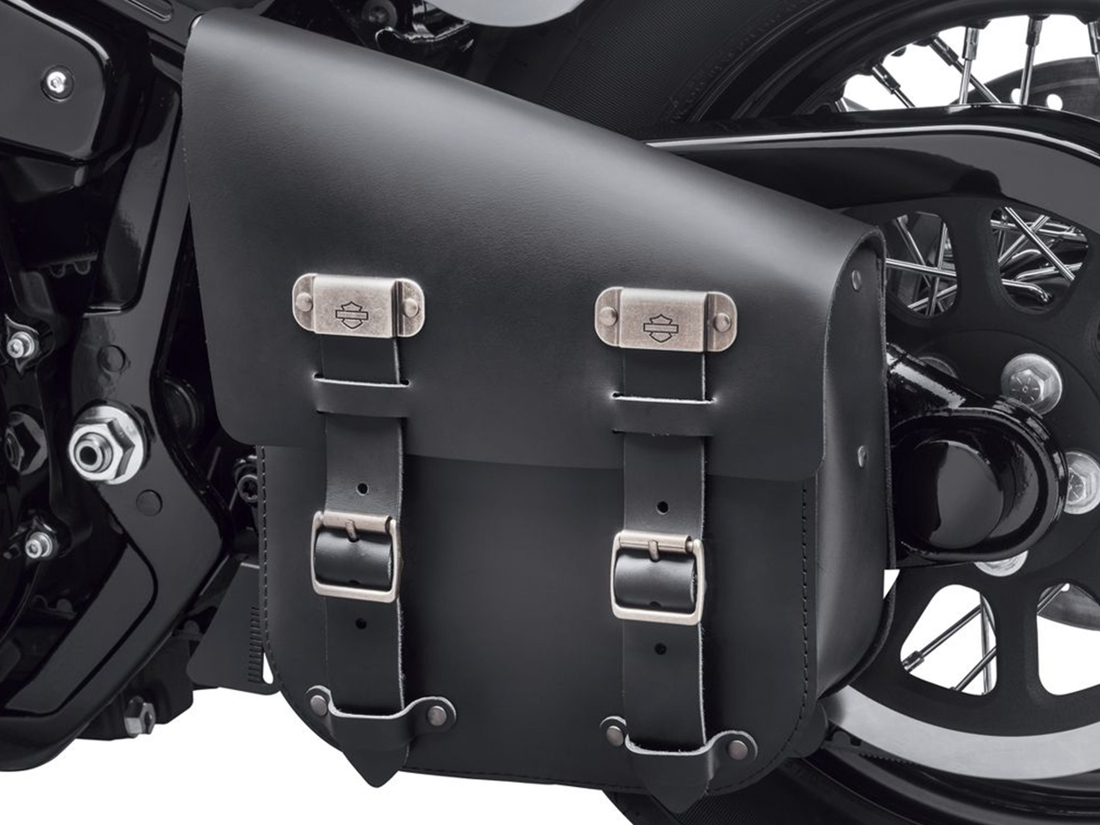 Weniger ist mehr. Diese stilvolle Schwingentasche bietet mehr als genug Platz für das Nötigste. Und Sie müssen weder Ihre Taschen vollstopfen noch den Soziussitz mit einer Tasche verkleiden. Sie schmiegt sich an die Kontur des Rahmens an und sieht mit ihrem angesagten Oldschool-Look einfach toll aus. Die Taschen sind aus schwerem Leder, und der Klappdeckel wird mit zwei klassischen Lederriemen und Chromschnallen geschlossen. Die halbsteif verstärkte Tasche wird mit einfach zu montierenden Halterungen und einstellbaren Schnellöffnungsriemen an der linken Seite der Schwinge angebracht. Volumen: Insgesamt 7,4 Liter. Diese tiefschwarze Schwingentasche aus schwerem Stiefelleder ist die perfekte Ergänzung zu jeder Lackierung oder jedem Custom-Stil. Der Klappdeckel wird mit zwei modernen Clipverschlüssen gesichert, die hinter traditionellen Lederriemen und Schnallen aus gebürstetem Nickel versteckt sind.