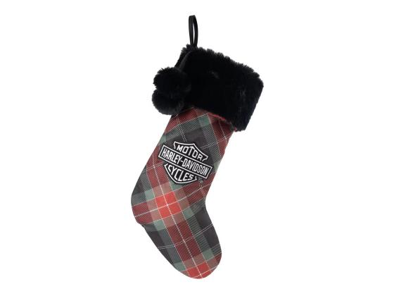Festlicher Weihnachtsstrumpf mit kariertem Feiertagsmuster, weichem schwarzem Kunstfellbesatz und Pompons. Gesticktes Bar & Shield Logo.