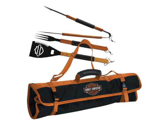 Das Set besteht aus Spachtel, Zange und Gabel in einem robusten Polyesterkoffer mit Bar & Shield-Logo. Alle Werkzeuge haben Holzgriffe mit Harley-Davidson-Aufdruck auf dem Gummigriff. Der Spatel verfügt außerdem über einen eingebauten Flaschenöffner und ein individuelles Bar & Shield-Logo. Nur von Hand waschen. Abmessungen (geschlossen): 56 x 15 x 32 cm