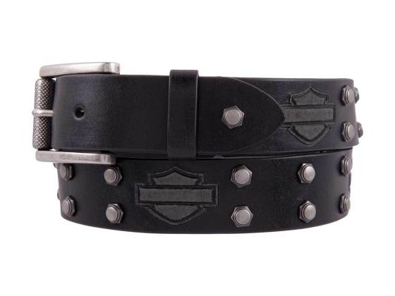 Harley-Davidson Herrengürtel "Bolt Bar & Shield". Dieser Gürtel ist robust und bereit für die Fahrt. Kein Zentimeter Kunstleder - gefertigt aus hochwertigem Echtleder mit glatter Oberfläche. Mit großartigen, geprägten Bar & Shield Logos mit Schraubendetails. Komplett mit antik vernickelter Schnalle. Exzellenter Qualitätsledergürtel, gemacht für jene Biker, die das Beste von allem wollen! Standardbreite: 1,5" (ca. 40mm). Die auswechselbare Schnalle ermöglicht es Ihnen, die Gürtelschnalle jederzeit gegen eine andere auszutauschen.
