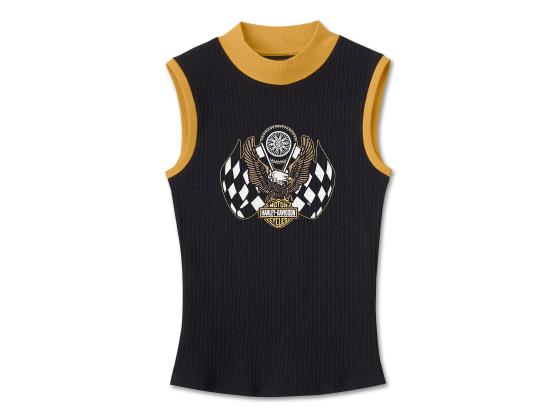 Das Trophy Sleeveless Top ist eine Retro-Hommage an unsere siegreiche Rennsport-Ära der 1970er Jahre. Es ist für einen strukturierten Look aus gerippter Baumwolle gefertigt, die gewaschen wurde, damit sie weich ist und sich wie eingetragen anfühlt. Die kürzere Silhouette sorgt für einen taillierten Look, während der Stehkragen und der kontrastierende Rippstrick-Saum unsere vom Rennsport inspirierten Motive ergänzen. Eine kleine Harley-Geschichtskunde: Dieses Adler-Logo war erstmals 1976 auf unseren limitierten Liberty Edition Modellen zur Feier von Amerikas 200-jährigem Bestehen zu sehen.