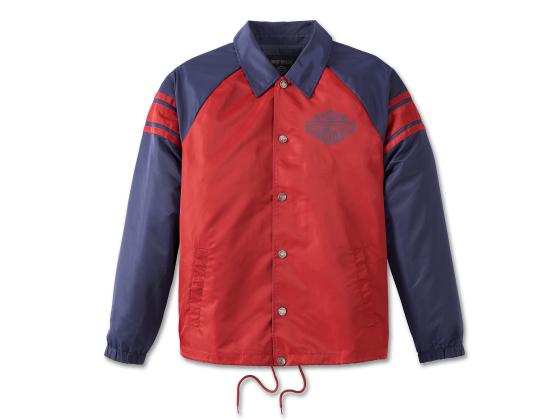 Unser Rennsport-Erbe verbindet sich mit klassischem, sportlichem Stil in der #1 Coaches Jacket. Ihr Nylontwill-Material ist atmungsaktiv, wasserabweisend und leicht. Diese Herrenjacke bietet viel Stauraum mit praktischen Taschen, einem Kordelzugbund und einem verdeckten Kragen mit Druckknöpfen, der beim Fahren nicht flattert. Unser ikonischstes Branding ziert die Vorderseite, während unser #1 Logo auf der Rückseite seinen Sieg beansprucht. Kenn die Geschichte - das Logo auf der Rückseite wurde ursprünglich 1969 entworfen, um unseren AMA Grand National Championship-Saisontitel zu feiern.