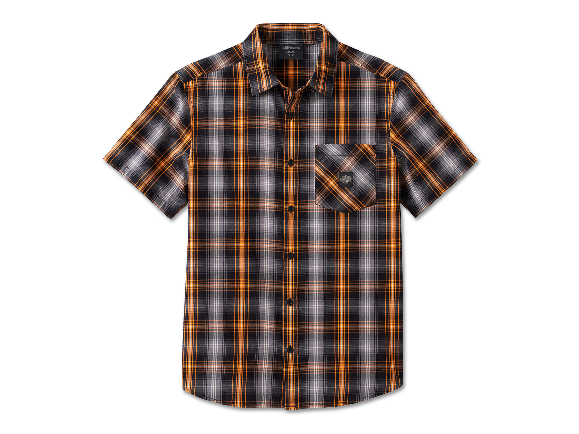 Unser Staple Short Sleeve Shirt verleiht dem Karo-Stil ein Harley-Upgrade. Dieses Button-Down-Hemd für Herren ist aus atmungsaktivem, aber dennoch robustem, leichtem Twill aus Baumwolle gefertigt und bietet lang anhaltenden Tragekomfort. Mit einem Hemdzipfelsaum, der sowohl über der Hose als auch eingesteckt toll aussieht, sowie einem Kragen mit versteckten Druckknöpfen, der beim Fahren an seinem Platz bleibt. Die Vorderseite ist minimal mit unserem gewebten Etikett gebrandet, damit das Motiv auf dem Rücken die ganze Aufmerksamkeit auf sich ziehen kann. Kleine Geschichtslektion: Die Version des Bar & Shield Logos auf dem Rücken entstand im Jahr 1963. Damals wurde es horizontal erweitert, um besser auf unsere Motorradtanks zu passen.