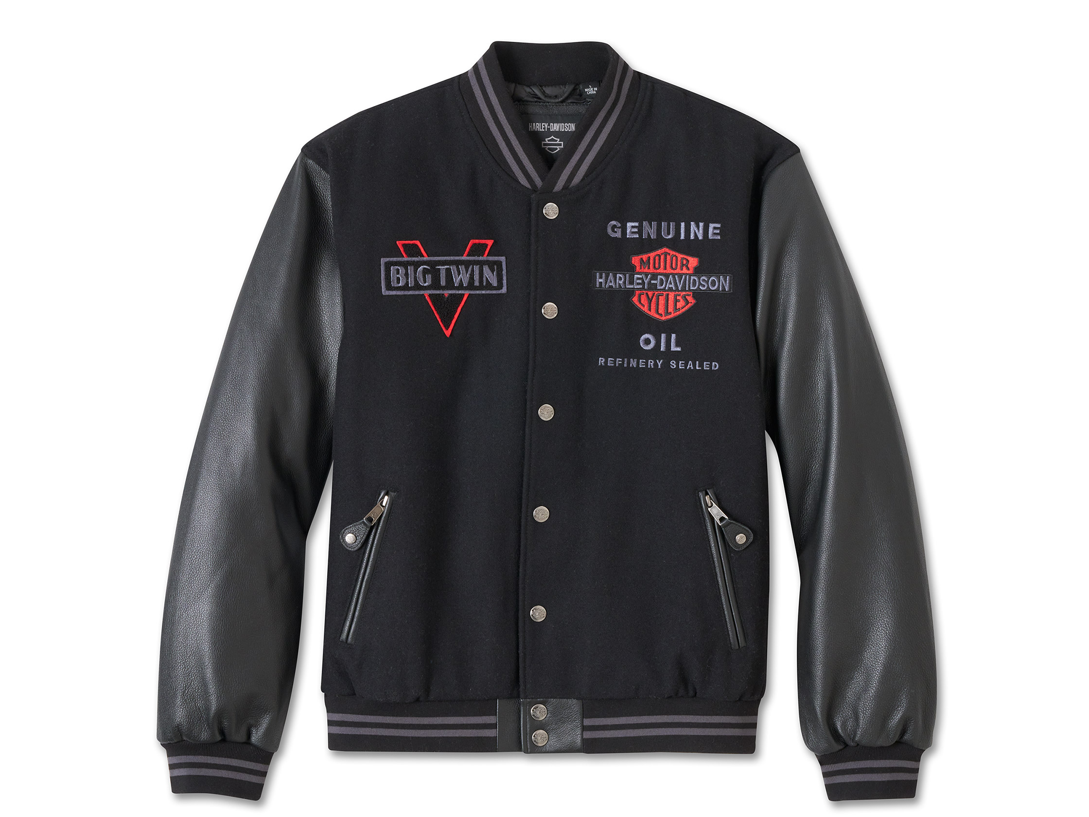 Die V-Twin Varsity Leather Jacket verleiht dem sportlichen H-D-Stil einen nostalgischen Touch. Diese limitierte Auflage ist aus einer Mischung aus weichem Leder und Stoff gefertigt, die langlebigen Komfort und Strapazierfähigkeit bietet und für zusätzliche Wärme isoliert ist. Sie verfügt über sichere Taschen, darunter eine mit Druckknöpfen verschließbare Innentasche, in der alles Wichtige verstaut werden kann, und Rippstrickbündchen an den Ärmeln für formstabilen Stretch. Die Herrenjacke wird durch Grafiken veredelt, die Elemente der Motorradgeschichte wie die Ölkanne aus den 30er Jahren und den Big Twin von einem Poster aus den 50er Jahren zitieren. Schnapp Dir Dein Exemplar so schnell wie möglich, bevor alle weg sind.