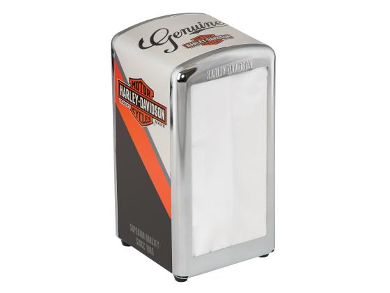 Vintage reproduction H-D"Nostalgic Bar & Shield Napkin Dispenser adds retro fun and flair to your table. Features full color graphics on formed steel and chrome plated trim with custom tooled Harley-Davidson logo. Spring-loaded dispensing mechanism and rubber feet make it a breeze to use. Napkins included. Dimensions: 9.5 cm x 19 cm x 11 cm