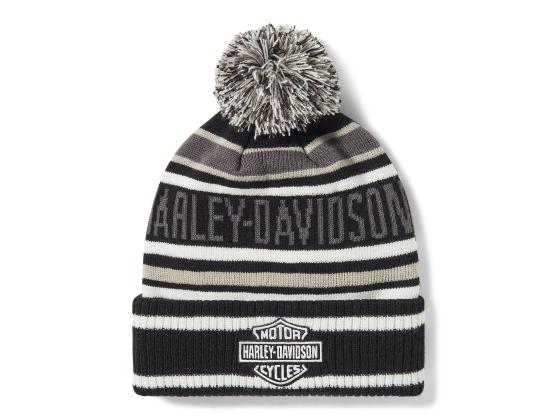 Bold, stay-warm style is all yours in our Harley-Davidson Stripe Pom Beanie. Its all-acrylic knit build delivers longwearing comfort without the itch of wool. This unisex outwear accessory is finished with a multi-colored knit pom, custom allover graphics and striping, plus an embroidered patch for added dimension.