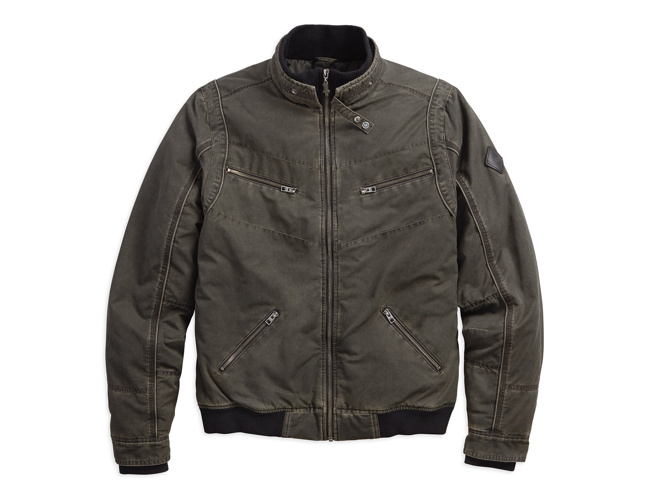 65% nylon, 35% cotton. Enzyme wash. Zippered front with snap neck closure. Rib-knit interior collar, interior cuffs and hem. Two zippered chest pockets and two zippered hand-warmer pockets. Leather patch on left sleeve.