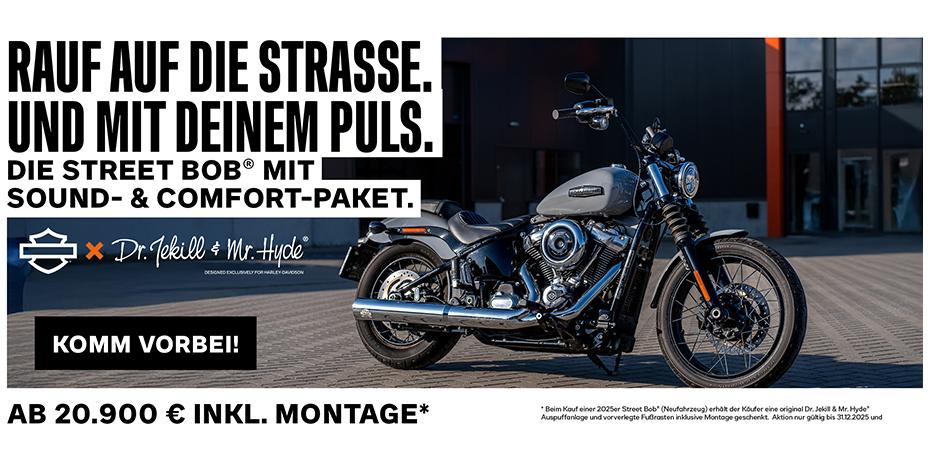 * Beim Kauf einer 2025er Street Bob (Neufahrzeug) erhält der Käufer eine original Dr. Jekill & Mr. Hyde Auspuffanlage und vorverlegte Fußrasten inklusive Montage geschenkt. Aktion nur gültig bis 31.12.2025 und nur, solange der Vorrat reicht.