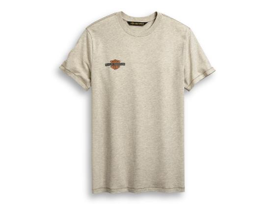 A contrasting pendant appliqué lends a vintage look to this men's short sleeve shirt. The sporty Racing Pendant Tee includes distressed graphics to up the authentic worn-in vibe. Stonewashing the cotton/poly jersey ensures an even greater softness and lived-in feel. Materials: 98% cotton, 2% polyester jersey.