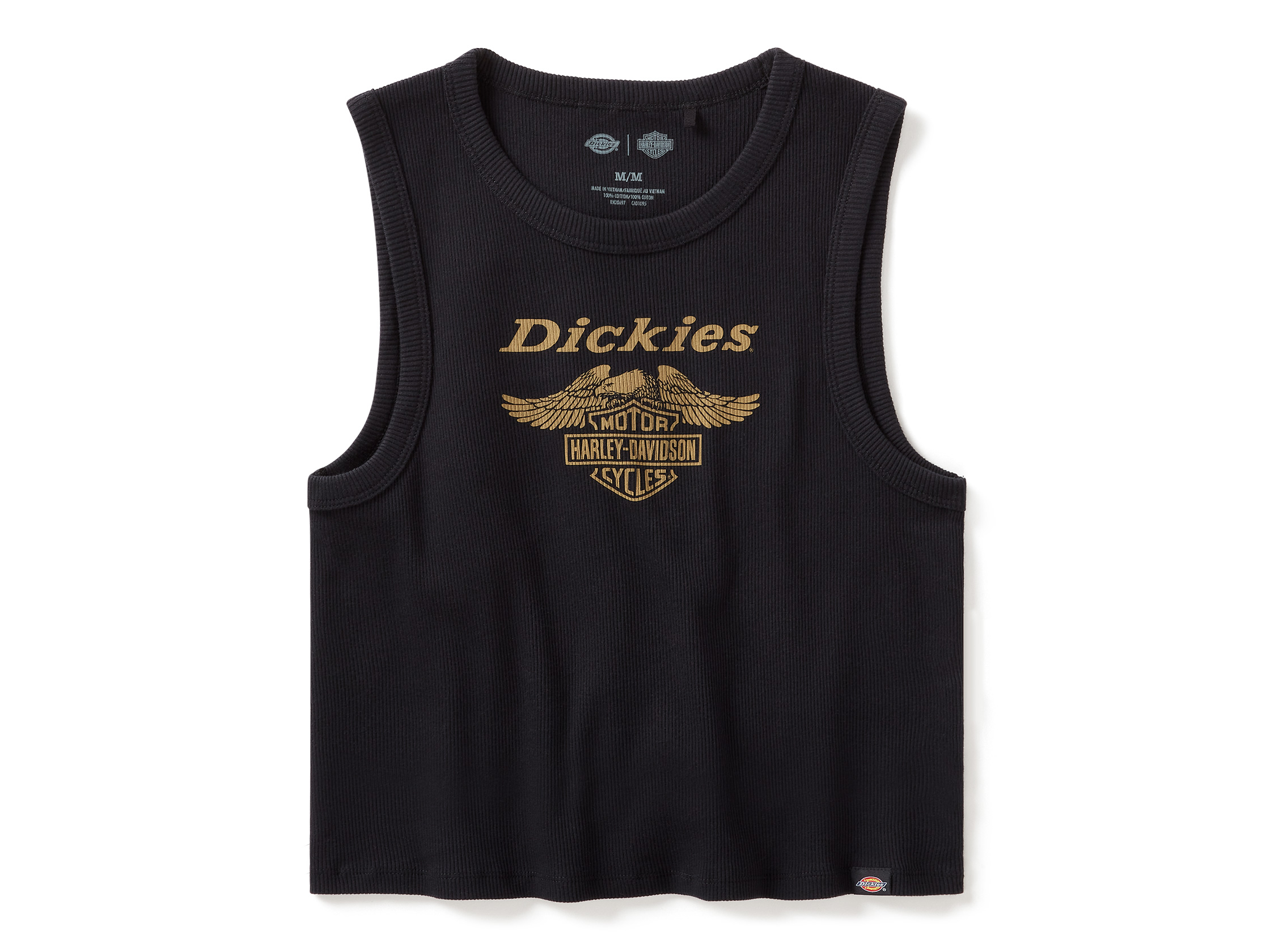 Flatter your shape in stay-cool comfort with the Dickies® x H-D® Racerback Cropped Eagle Tank. Made from breathable 100% cotton that's ribbed for a textured look. It delivers a regular fit in a slightly cropped silhouette that sits at or just above the waistline. Finished with signature graphics and branding on front. Part of the Dickies® x H-D® Collaboration—special-edition apparel that merges iconic workwear with iconic motorcycle culture.