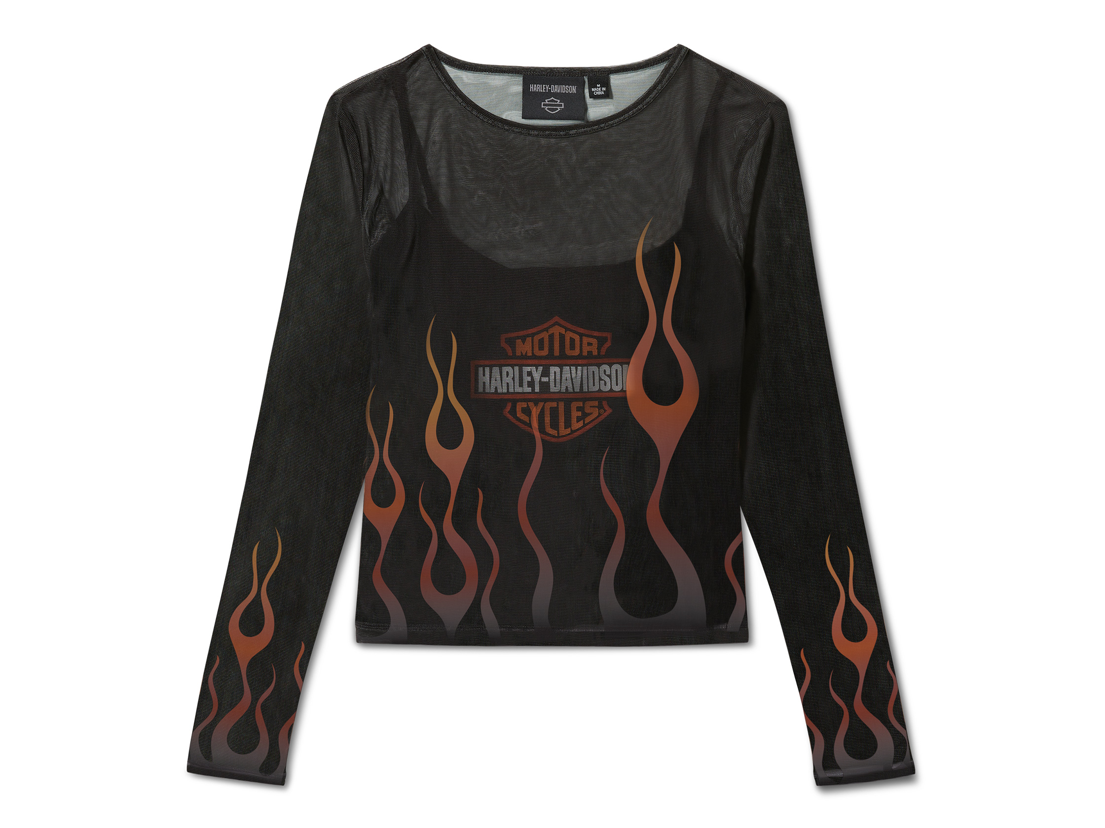 Looking hot is effortless in our Flames For Days Mesh Top. This two-piece set includes a fitted camisole with and a long sleeve overlay mesh tee. The sheer outer top is crafted from lightweight polyester mesh with a hit of spandex for added stretch. The removable polyester/cotton jersey camisole also has a hit of spandex for added stretch plus adjustable spaghetti straps. This women's twofer defines standout style with its gradient flame graphics on the body and searing up the sleeves.