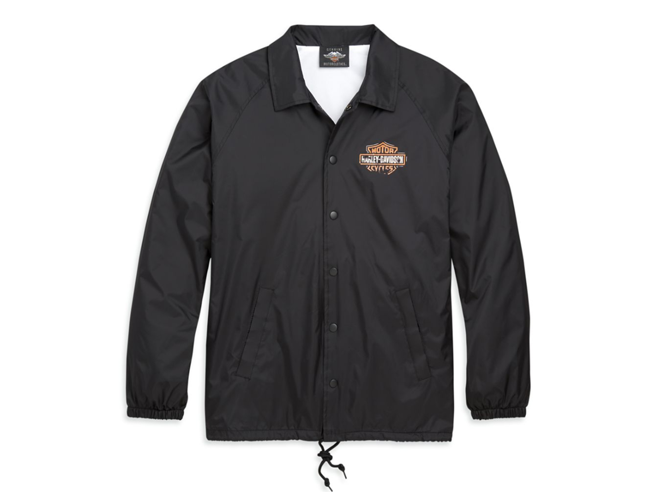 Flashback to the glory days of high school, shall we? That's the look you capture in this men's Patina Bar & Shield Logo Coaches Jacket. It's an all-black throwback that features our patina-printed Bar & Shield logo subtle on the front and screamin' on the back. This men's casual jacket includes a snap-front closure with drawstring hem. Elastic cuffs keep the chill out while you cheer on your favorite team from the stands. Materials: 100% nylon shell. 100% polyester lining.