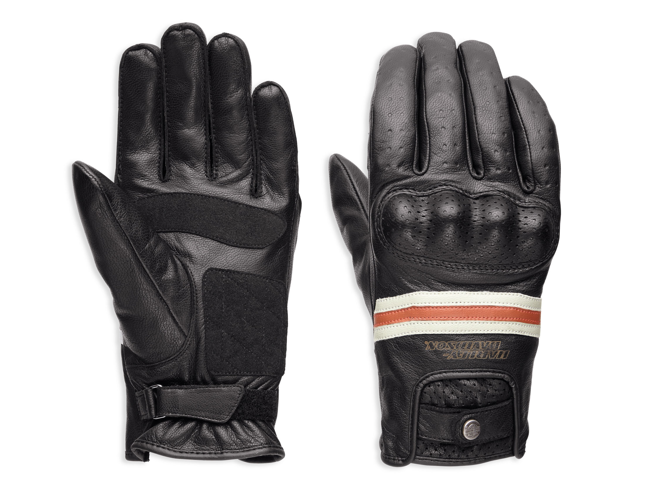 Fit & Mobility: Comfort seams. Ergonomic thumb and pre-curved fingers. Elastic wrist with adjustable wrist tab closure and snap tab. Ride-Enhancing Features: Hard, molded knuckle protector. Reinforced amara palm. Design Details: Decorative perforated leather accents. Printed graphics. Materials: Goatskin leather. Tricot lining. Certification: Meets or exceeds CE requirements for personal protective clothing.