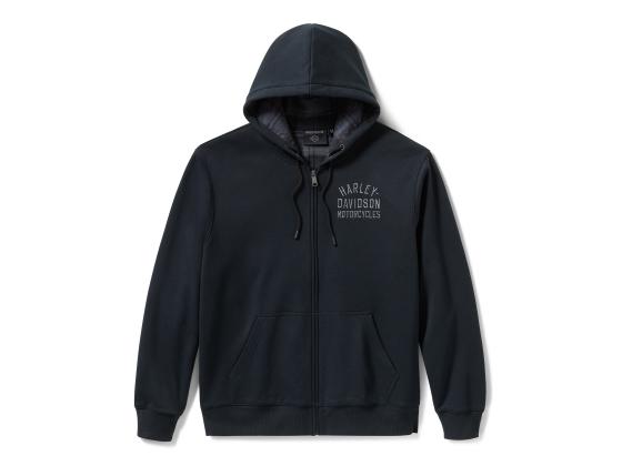 Enduring Harley style lives on our Plaid Lined Zip Hoodie. It's designed with a lined hood that wisely features dual openings to tuck in the drawcord so it won't flap around under your riding gear. This men's hoodie in a cotton/polyester fleece build also has an interior stash pocket, and an extra layer of style and warmth with its plaid brushed twill lining. The front features embroidered graphics that resemble racing team jerseys from our archives while a patch of our most iconic branding fills the back.