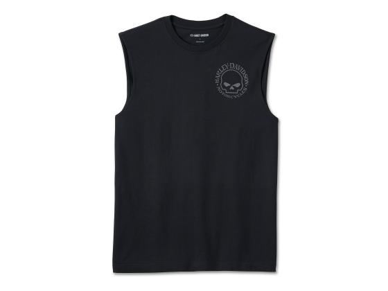 Our Willie G Skull Muscle Tee is an ideal pack-long shirt for rides and rallies. It sleeveless style is crafted from a breathable midweight cut of cotton jersey with a rib-knit neckline to keep its shape. Finished with the Willie G. Davidson Skull brooding on front and boasting on back. Know the history—Willie G originally created the Skull for the 2000 Daytona Bike Week, and it's been a rider favorite ever since.