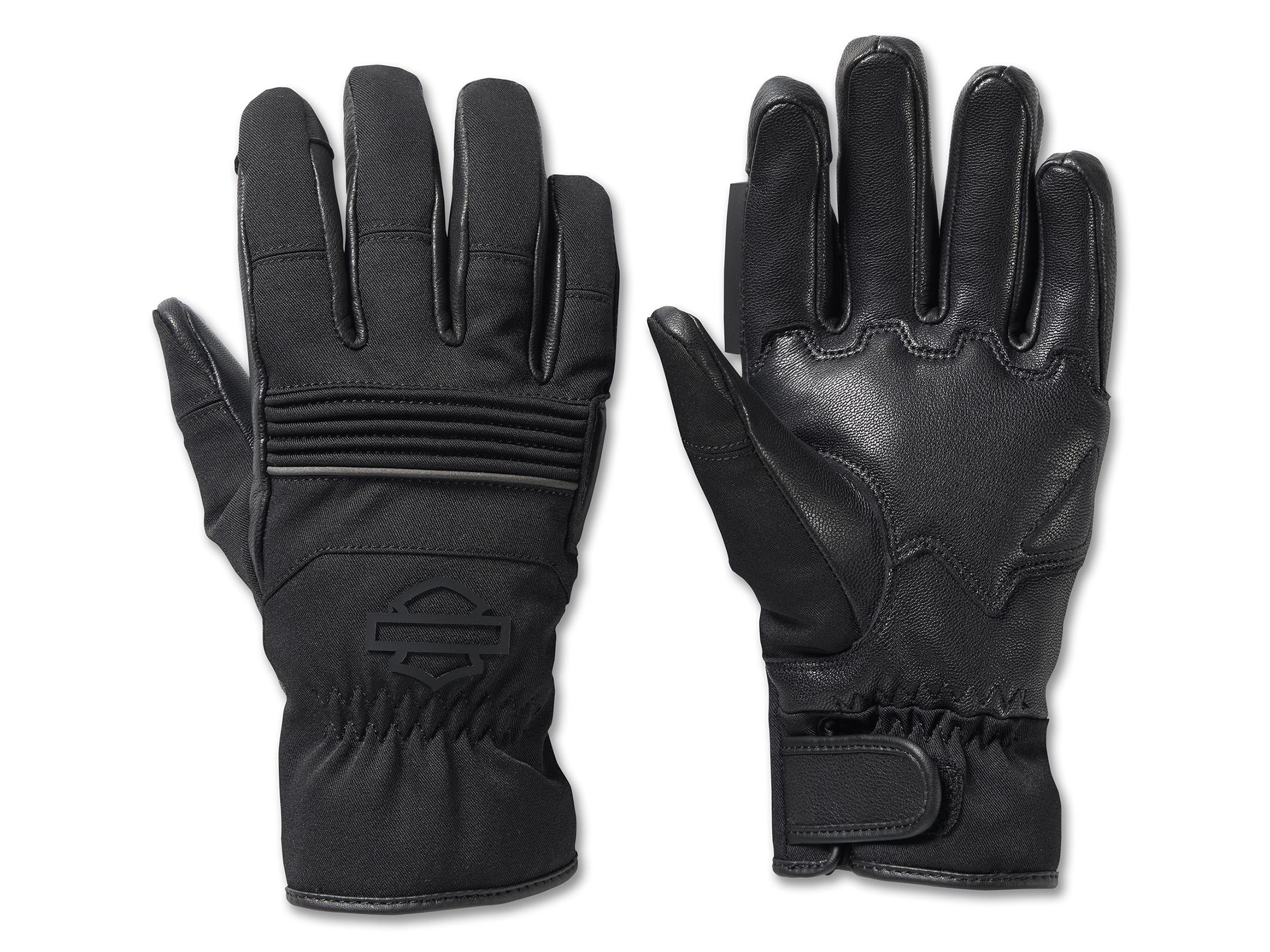 Warmth, waterproof, comfortable - all three of these qualities and so much more are built into our Apex Mixed Media Gloves. Insulated and crafted from a rugged mix of materials, they're waterproof and seam sealed to keep unwanted weather elements out while you ride. They thought of everything when they engineered these gloves—from power-stretch knuckles and padded palms to touch-screen compatibility and carbon black reflective material for added visibility. But as an added functional bonus, these riding gloves are designed with a visor squeegee on left hand index finger and a microfiber nose wipe on the thumb panel. They're finished with our open Bar & Shield for an understated yet authentic Harley-Davidson look.
