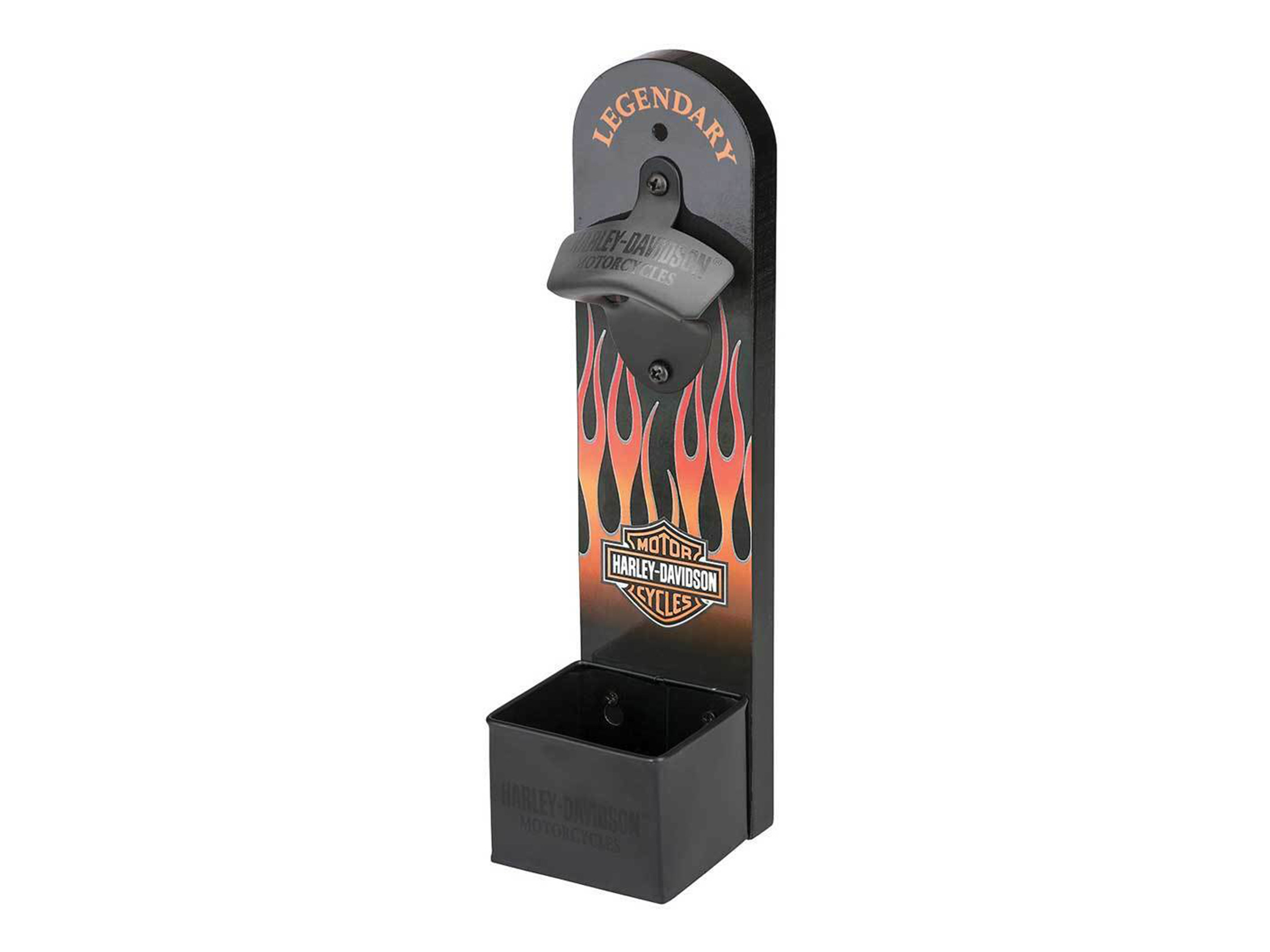 H-D" Flames Wall Mount Bottle Opener is a functional accent piece for your bar. Features vibrant H-D flames graphic with metal bottle opener and removable cap catcher. Mounting hardware included.
