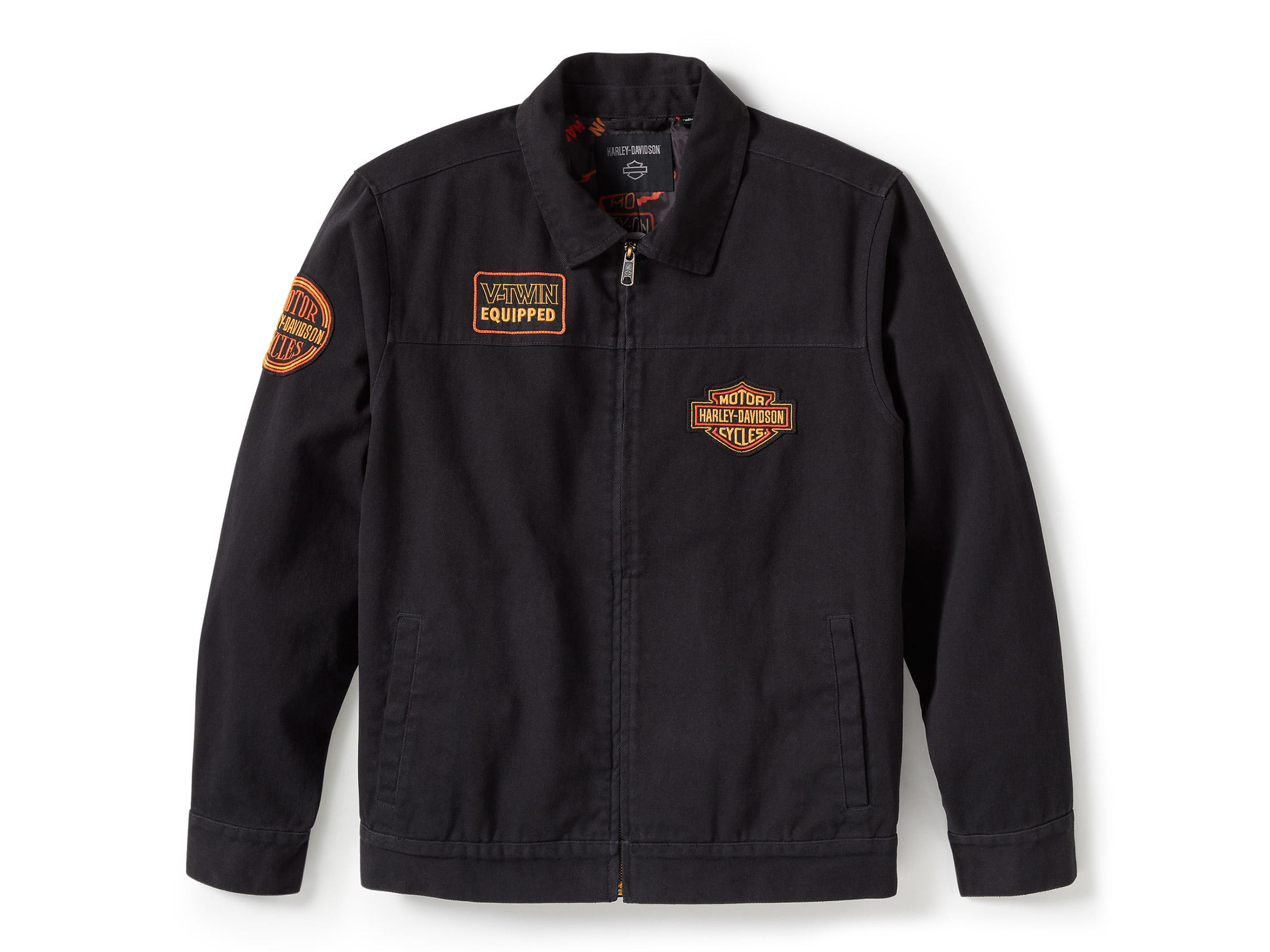 The Limited Edition Iron Bond II Twill Jacket delivers authentic Harley style for retro fans. Made from cotton twill, it's stonewashed for a worn-in look and features a hidden-snap collar that stays put while riding. What really sets this men's jacket apart is the iconic mix of graphics inspired by material from our archives. The specially printed allover lining showcases 1980s tank art, while the eagle on the back was first seen on our 1976 FLH-1200 Liberty Edition. Grab yours while supplies last.