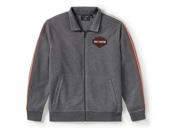 Sporty style holds true to our core color palate on the Essential Fleece Zip Front Track Jacket. This men's activewear is made from a heavyweight interlock blend that's firm and absorbent yet super soft. It features sleeve striping and a hit of embroidered branding for a classic H-D look.
