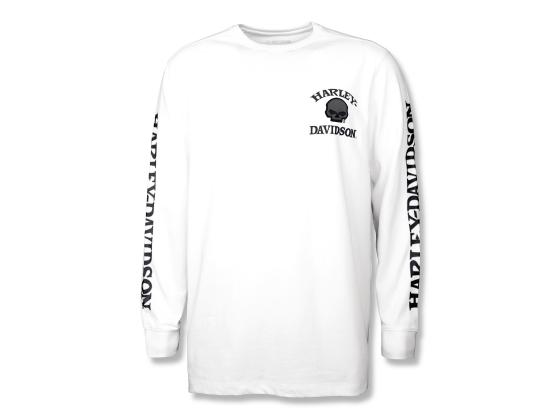 Comfortable, bold, legendary…The Willie G" Skull Long Sleeve Tee is all three. It's made from super soft cotton jersey in a relaxed fit with a rib-knit neck and cuffs to help keep its shape. This men's long sleeve t-shirt showcases the fearless Willie G Skull plus our namesake riding tandem down the sleeves. Know the history—though the Skull is one of his most popular creations, Willie G. Davidson also designed several motorcycles, including the 1971 FX Super Glide® and the 1977 FXS Low Rider®.