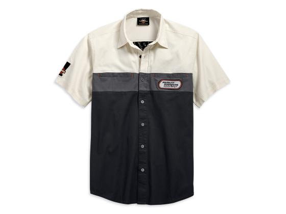 The classic colorblock style is a fan favorite season after season. Cut from rugged (but washed soft) cotton twill, the H-D® Racing Colorblock Shirt looks good trackside or in the office. Check out the patches and graphics. The race-inspired embroidery on this men's short sleeve shirt is legit.