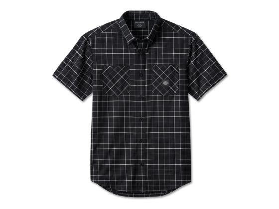 From Monday workdays through Sunday fundays, the Bar & Shield Short Sleeve Shirt is a versatile and comfortable pick. It features a shirttail hem that looks great tucked in or out, plus a hidden snap-down collar that stays put under riding gear. This men's button down in a relaxed fit is made from a rugged cut of cotton/polyester twill with a hit of spandex for added stretch. Its check pattern is an ideal backdrop for our branded label on front and printed Bar & Shield on back.