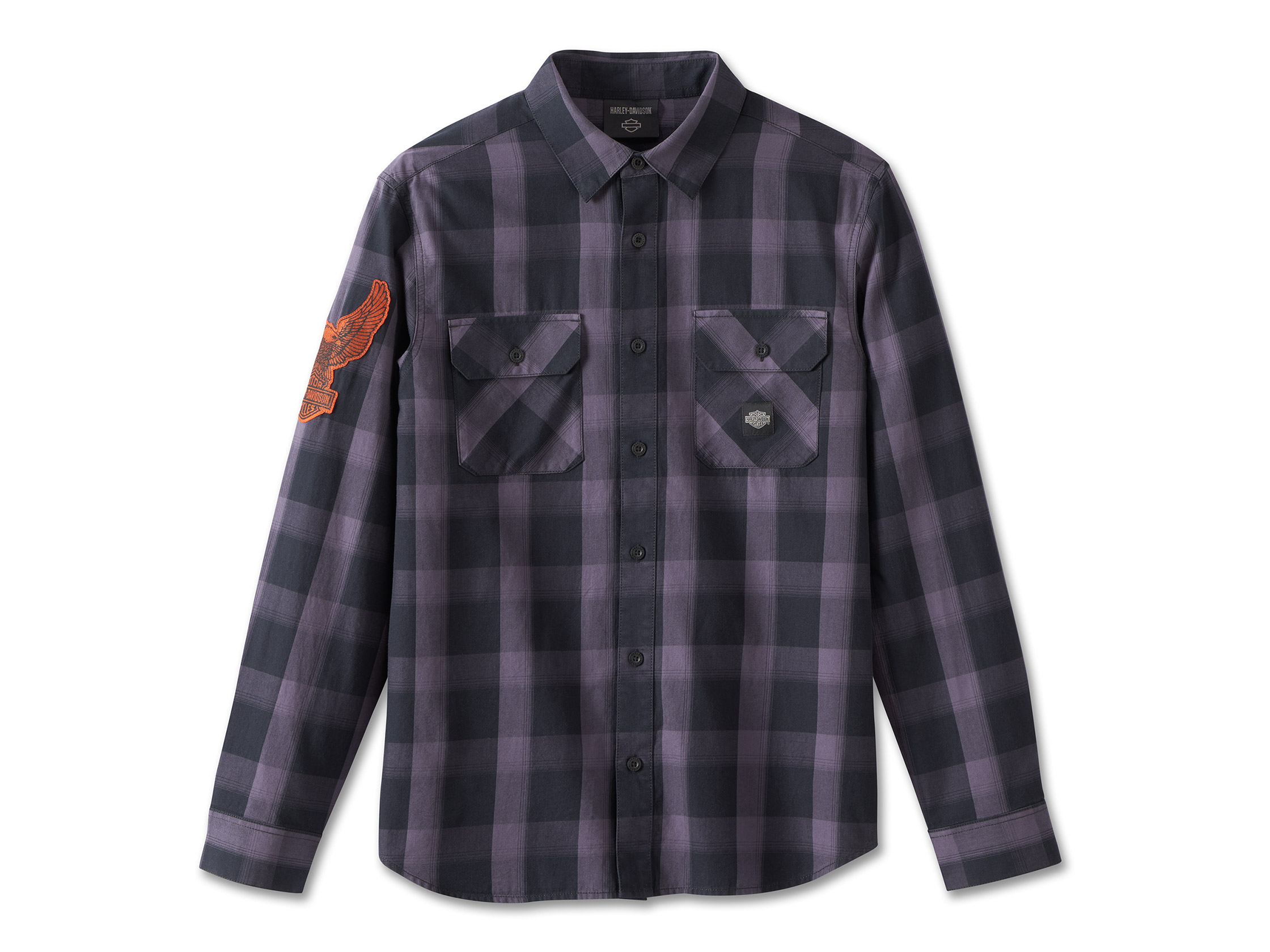 Plaid gets a hit of Harley pride in our Motorbreath Long Sleeve Shirt. Crafted from durable yet breathable cotton twill that's washed for softness in a timeless plaid pattern. Features sturdy button closures plus hidden snaps on the collar to keep it down while you're riding. Finished with a printed felt patch in a pop of our iconic orange on the sleeve, plus our branded woven label gracing the front. Fun fact—the Eagle logo on this patch made its debut on tank decals for our 1976 models honoring America's 200th Bicentennial Anniversary.