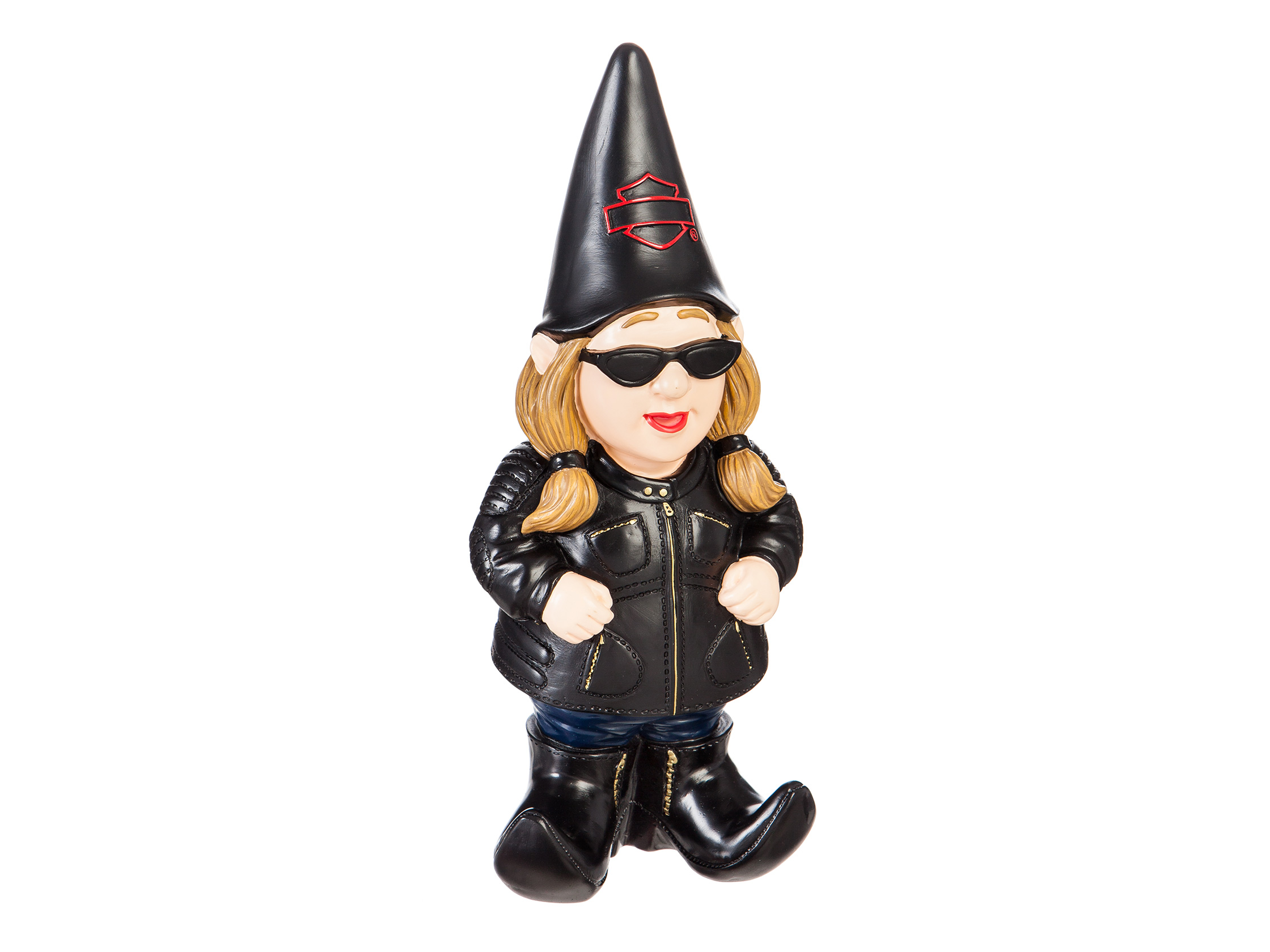 Harley-Davidson® Biker Themed Garden Gnome has now a girlfriend. First, a little history. Garden Gnomes were first created in 1840's Germany. Within 10-years these statues spread all across Europe. They're popularity spread because these Gnomes are believed to bring good luck to your garden. Even the most cynical among us might want to agree. These little fellows do have their charms. This gnome is made of durable and long lived Poly Stone", which is UV, fire, chemical, and stain resistant. Now you can also bring good luck to your favorite rider with this biker themed gnome. She is in full on rider gear and looks as lit as her partner. The Gnomette stands 11-inches (28cm) high, is 4.5-inches (11cm) wide and 3.5-inches (9cm) deep