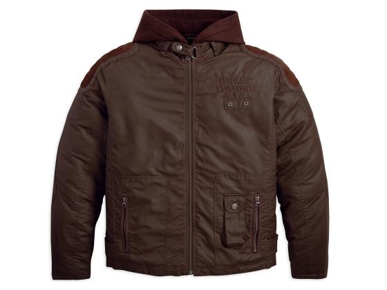 100% nylon dobby twill. 100% polyester fleece body lining and 100% polyester sleeve lining. Buffalo leather trim at elbows and shoulders. Removable, zip-off hood. Snap-tab mandarin collar. Zipper front. Action back. Zipper cuffs. Adjustable waist tabs. Two zipper hand-warmer pockets. Badge holder. Knife pocket. Interior pocket system with one horizontal pocket and one vertical pocket.