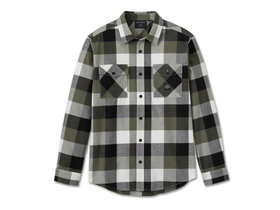 From workdays to riding days, this men's button down is a style staple. Made durable yet soft from brushed cotton twill in a relaxed fit, our Essence Long Sleeve Flannel Shirt features button closures plus a hidden snap-down collar that won't flap around under riding gear. The warm, fall-inspired colors in a buffalo check plaid pattern get a hit of branding on front for a lowkey H-D look.