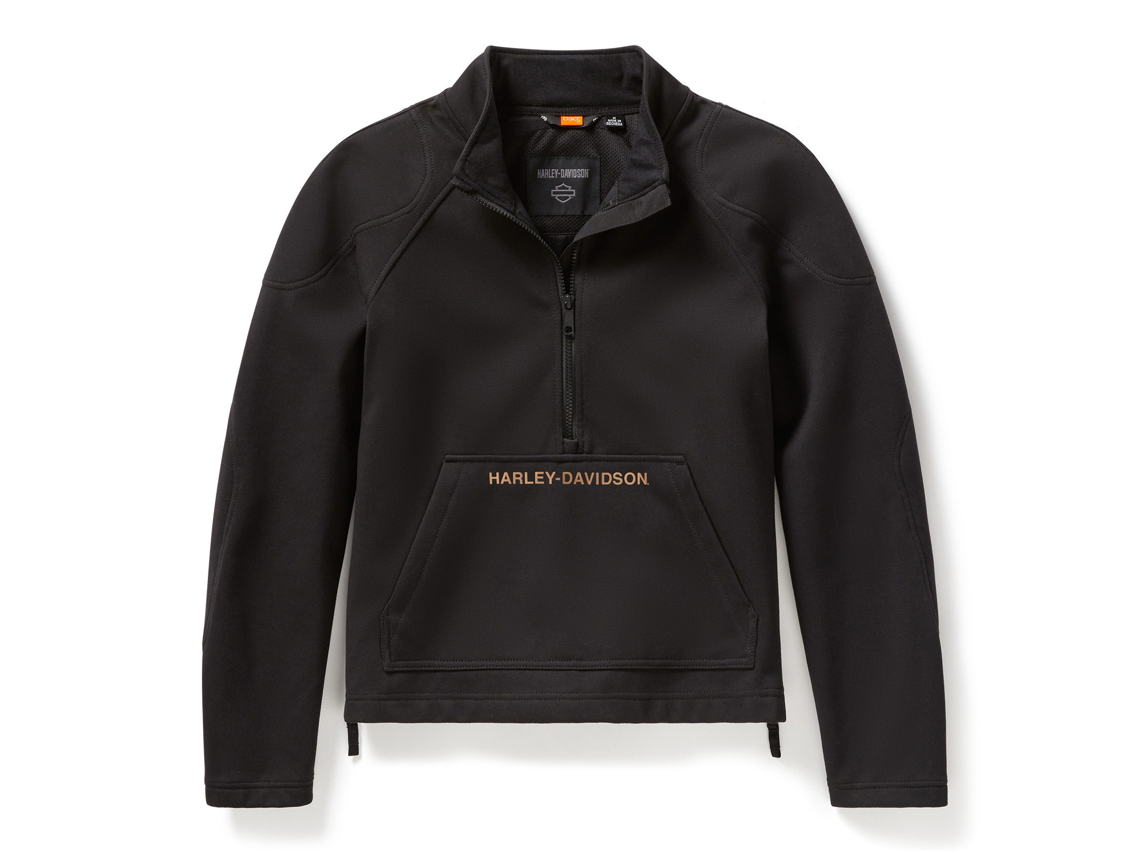 Contemporary moto style synchs with enhanced riding protection in our latest H-D® Deflector Half Zip Riding Fleece. Its wisely engineered design is windproof and loaded with features like air-loving side vents, reflective material to enhance visibility, and a zippered kangaroo pocket for securing essentials. Built from heavyweight laminated fleece, it includes D3O® Ghost" armor in the shoulders and elbows for impact protection. This women's motorcycling fleece is also tested and certified to meet abrasion, tear, and seam strength requirements (more details below). Its sleek look is finished with a reflective screen print of our modern graphics on the front and back. Get familiar with all its specs, then order yours ASAP.