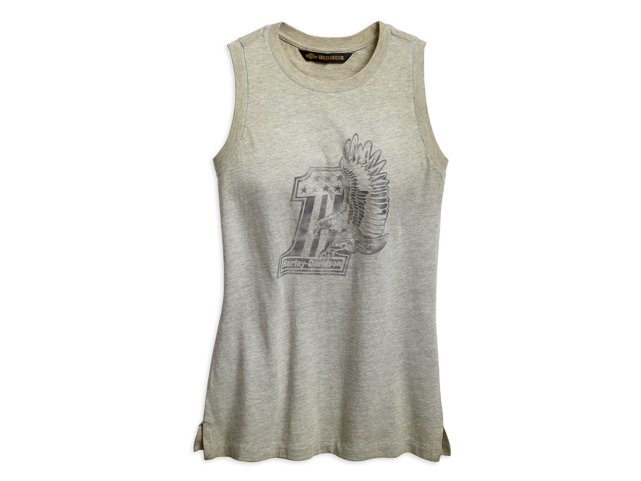 Show off your tattooed guns in the #1 Eagle Muscle Tee. Vintage race graphics are flocked and overprinted to give this women's sleeveless top a worn look.