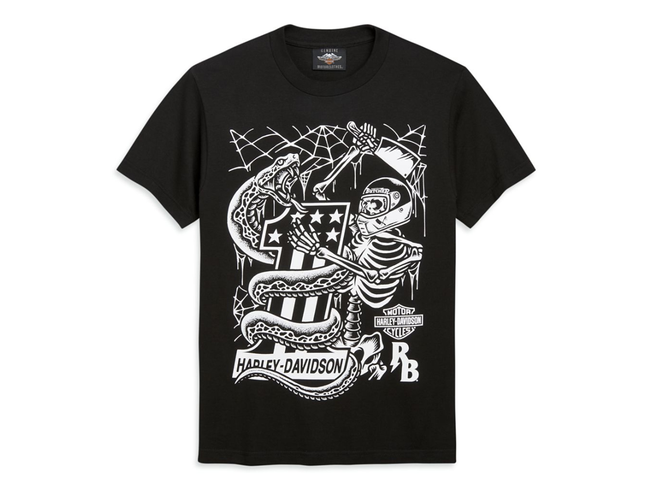 We're super proud to announce this special collaboration with Rusty Butcher. The H-D® x Rusty Butcher Snake Short Sleeve Tee is one of several original designs. Each is cut from hearty black cotton and printed with wicked-awesome art meant to capture the slightly twisted, live-fast attitude of the Rusty Butcher brand. This men's short sleeve shirt includes the cleaver-clad skeleton so you know it's legit. Materials: 100% cotton.