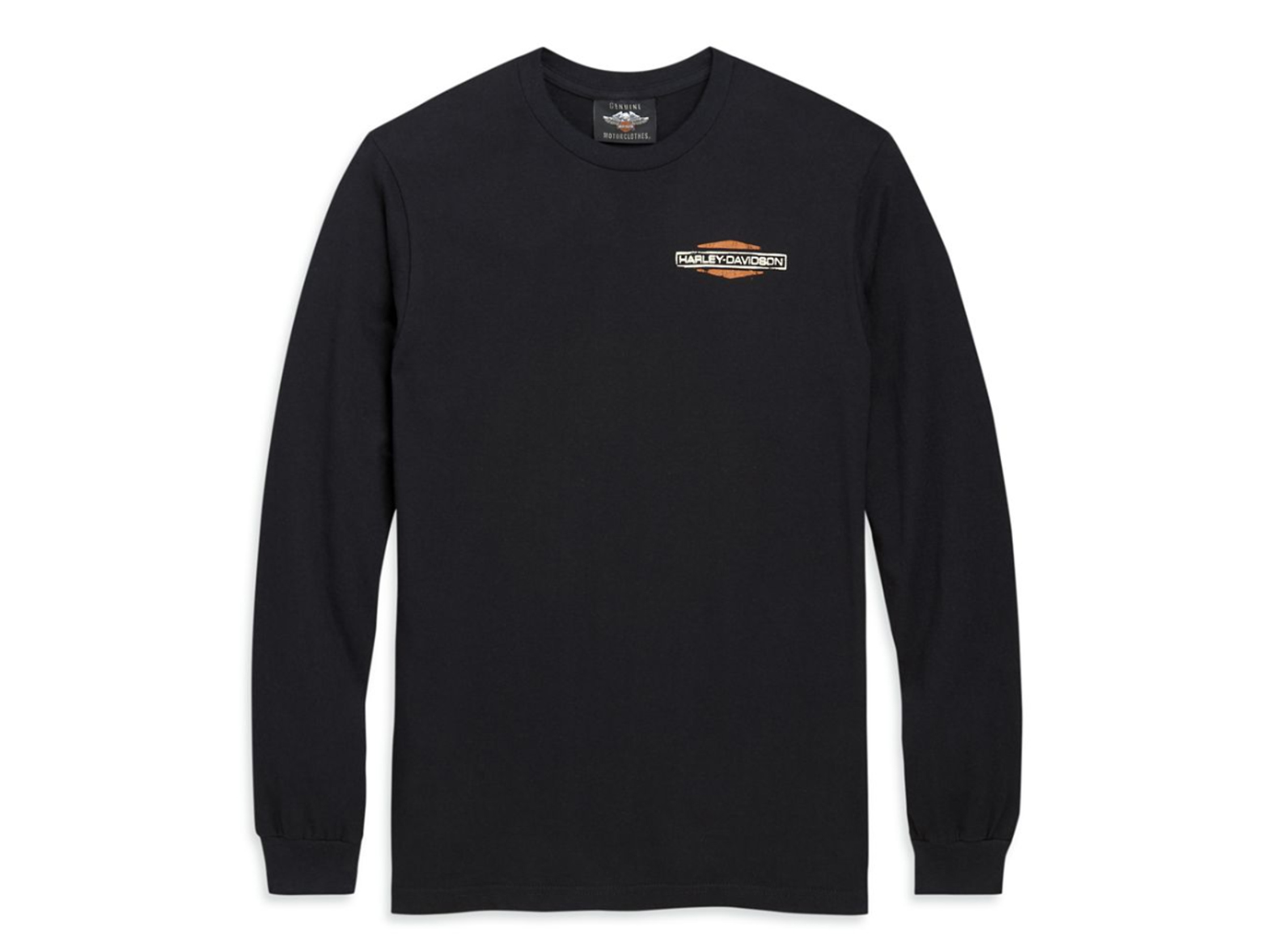 Classic and comfortable...that's the Patina Bar & Shield Logo Long Sleeve Tee for men in two words. The pure cotton fabric is soft, while the black shade hides oil stains from wrenching or BBQ stains from the food truck. Our timeless patina-printed Bar & Shield logo adds a punch of orange on the front and a big hit of color on the back. This men's long sleeve shirt has a loaded-with-wear-and-tear look that's ready to ride. Materials: 100% combed ring spun cotton.