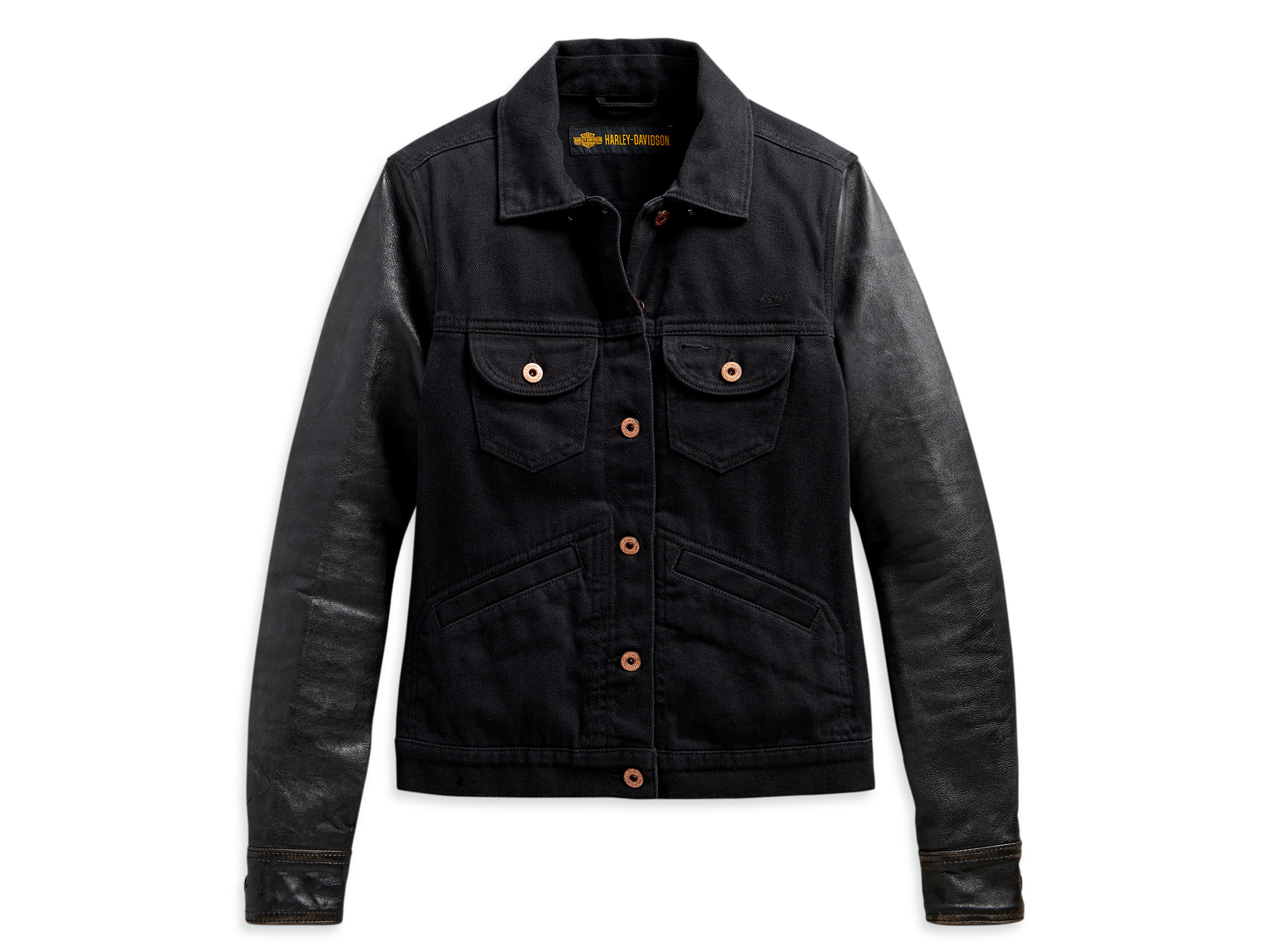 The Logo Leather Sleeve Denim Jacket takes two of a rider's most tried-and-trusted materials and combines them for a timeless look. Rugged leather sleeves are rubbed for a vintage look, and the twill body is well washed for a been-there finish. This women's casual jacket is a year-round asset.