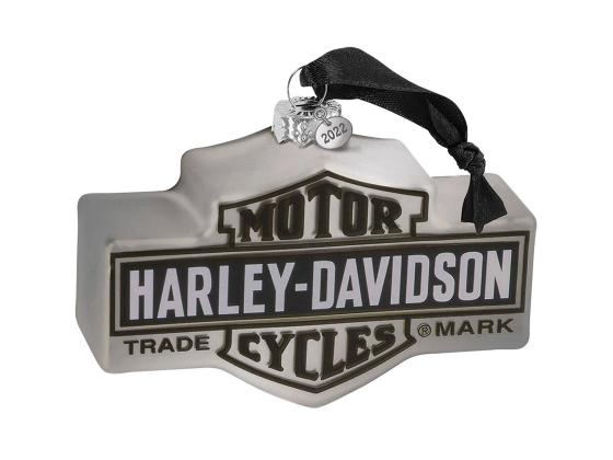 Blown glass Trademark logo ornament. Dated 2022 on charm. Dimensions: 10 x 5 x 3 cm.