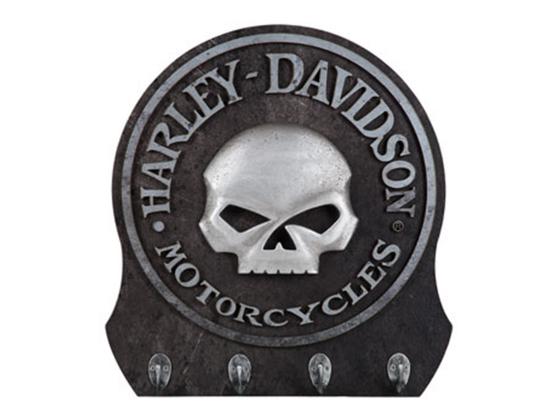 H-D® Skull Key Rack with four hooks keeps you organized in style. Features include hand finished, custom sculpted 3-D skull and applique letters. Textured finish completes the look.