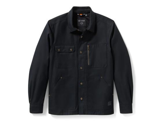 For understated style that emphasizes comfort, go the distance in our H-D® Chore Riding Jacket. It's built from a heavyweight twill blend with zippered pockets for securing essentials, reflective material to enhance visibility, and a hidden snap-down collar that won't flap around during rides. This men's motorcycle jacket is equipped with superior impact protection from our D3O® Ghost" armor at the shoulders and elbows, plus it's tested and certified to meet abrasion, tear, and seam strength requirements (more details below). Its branding stays lowkey with a leather patch at the front hem and tonal embroidery on back. See the specs below, then snag yours now.