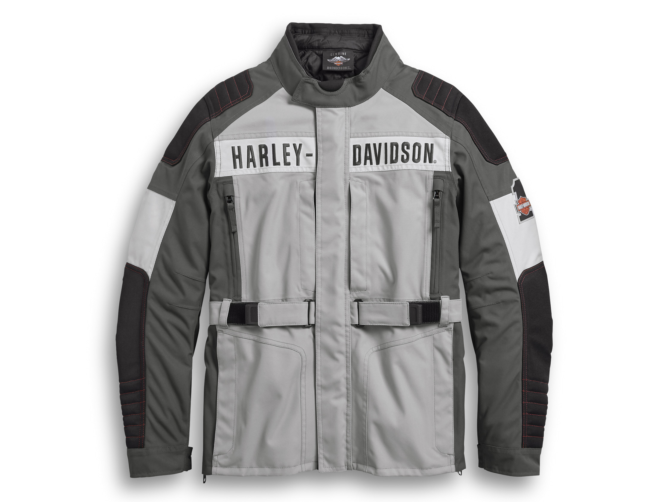 Fit & Mobility: Action back. Pre-curved sleeves with inner arm sleeve darts for less bulk. Adjustable waist belt. Two side zipper gussets. Jacket-to-pant zipper helps prevent jacket from riding up and connects to any Harley-Davidson® riding pant with a jacketto-pant zipper. Ride-Enhancing Features: EN 1621-1 CE-approved removable body armor at elbows and shoulders. Back body armor pocket fits lightweight Dainese Pro-Armor back body armor (98317-19VR, sold separately). Padded shoulders, elbows, and lower arms. Mandarin collar with comfort collar roll, chin pad, and neck cinch. Two-way zipper front with interior and exterior storm flaps. Adjustable cuffs. Reinforced elbows, lower arms, and shoulders. 3M" Scotchlite" Reflective Material appliqué graphics.