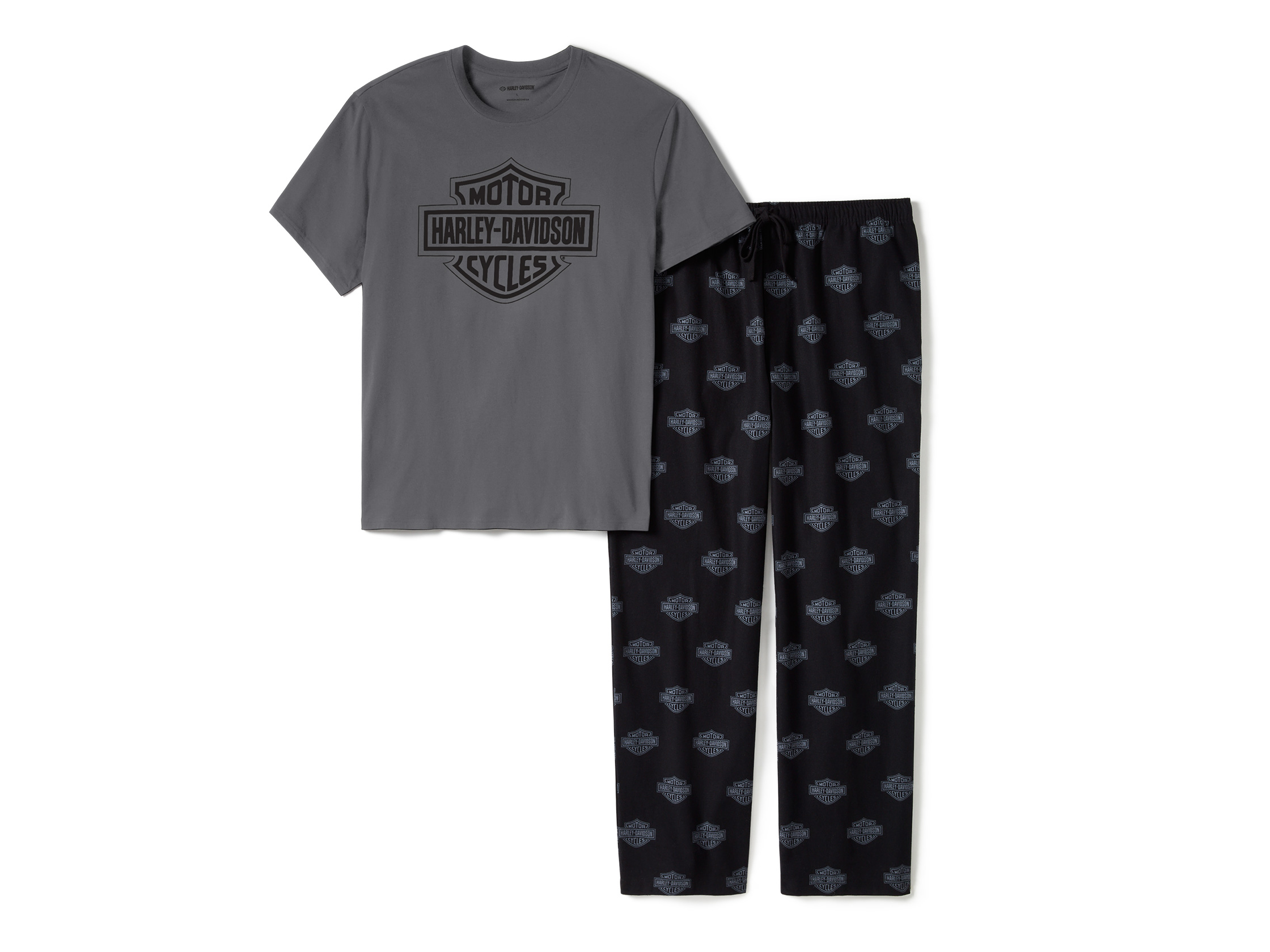 Bedtime gets an H-D upgrade with our Bar & Shield Pajama Pants Set. The short sleeve top is made from a soft cotton/modal blend with a rib-knit neckline to help keep its shape. The bottoms are a cozy cut of cotton flannel with a drawstring waist. These men's pajamas are finished with an allover custom pattern on the bottoms and a big Bar & Shield parked on the top.
