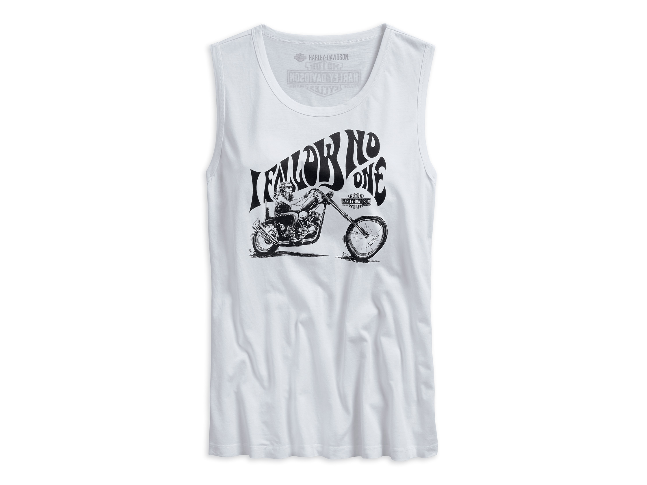 The groovy vintage art on this women's sleeveless top affirms every lady enthusiast. Make a statement with the bold Follow No One Muscle Tee.