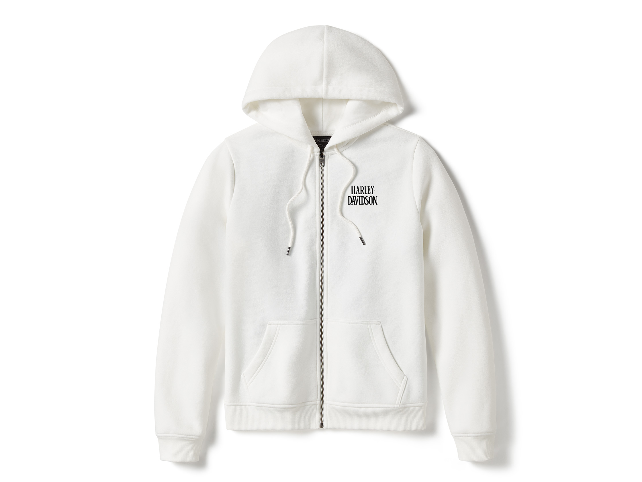 Your look hails a creative legacy in the Willie G" Skull Full Zip Hoodie. Crafted for longwearing comfort from cotton/polyester fleece, this women's zip up hooded sweatshirt delivers a relaxed fit. Its jersey-lined hood wisely features dual openings to tuck the drawcord in so it won't flap around under your gear as you ride. It's minimally branded on front to make way for the fearless Willie G Skull graphics on back. Though the Skull is one of his most popular creations, Willie G. Davidson also designed several motorcycles, including the 1971 FX Super Glide® and the 1977 FXS Low Rider®.