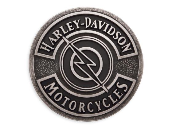 Die Lightning Bolt Schnalle bietet ein Silber-Finish im Antik-Look mit einer mattschwarz texturierten Füllung für tollen Kontrast. Diese Herrengürtelschnalle passt zu allen Harley-Gürteln mit 1½" Breite. Zinklegierung. 7,6 cm Durchmesser.