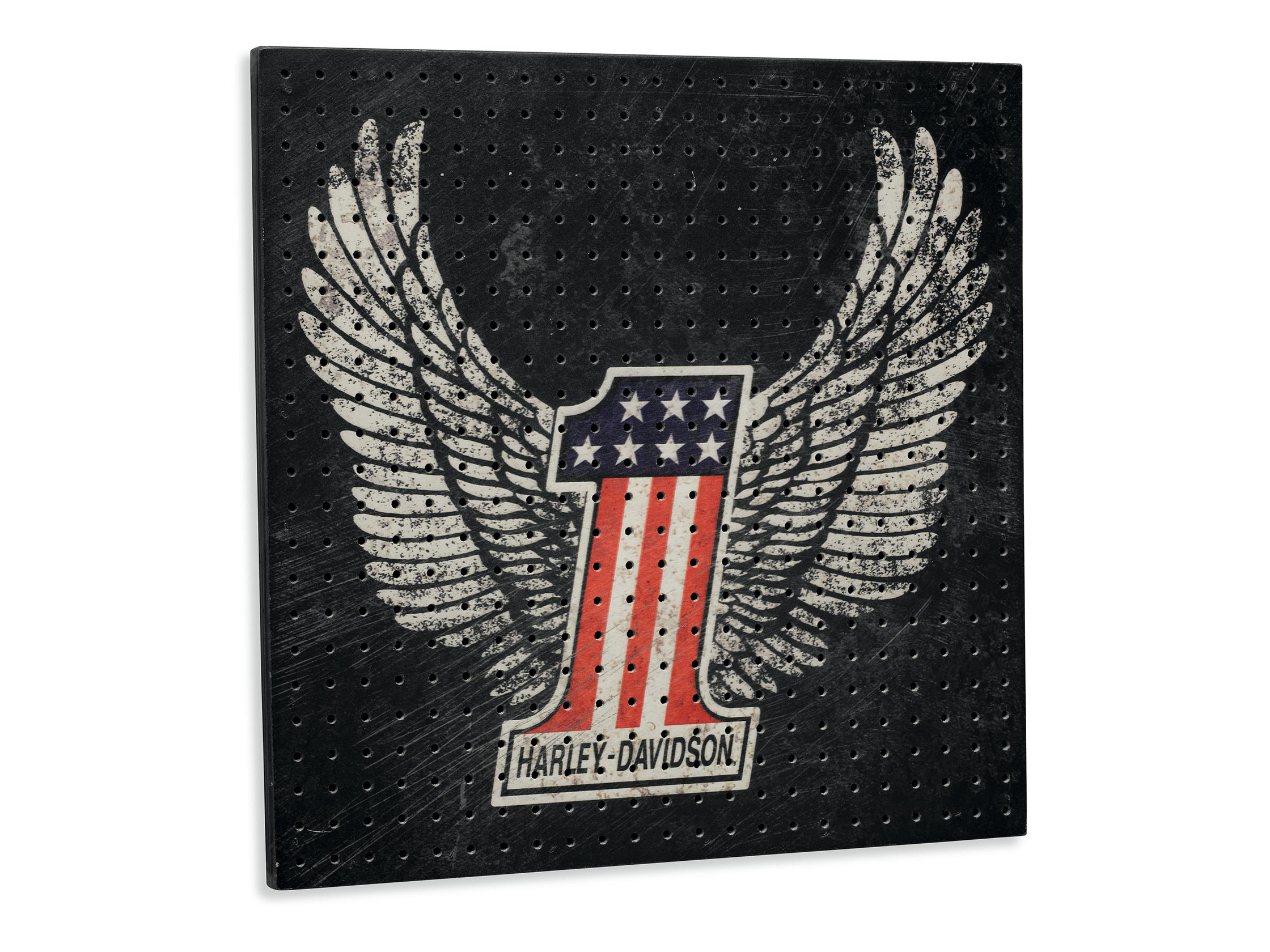 Schaffen Sie sich Ihren eigenen Harley®-Arbeitsplatz in Ihrer Garage oder Ihrem Keller, wenn Sie den H-D® Winged #1 Werkzeughalter installieren. Die Druckgrafiken sind UV-gehärtet und lichtecht und tragen das große rote, weiße und blaue #1-Logo mit Flügeln. Inklusive vier Haken, um Ihnen den Einstieg zu erleichtern. Mit Hardware auf der Rückseite zum einfachen Aufhängen sind Sie im Handumdrehen im Geschäft. Maße 59,7 cm quadratisch.