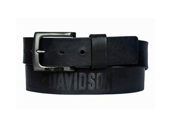 Glattes, geschmeidiges und strapazierfähiges Echtleder mit vernickelter Schnalle. Schwarz-auf-Schwarz Harley-Davidson Grafik.