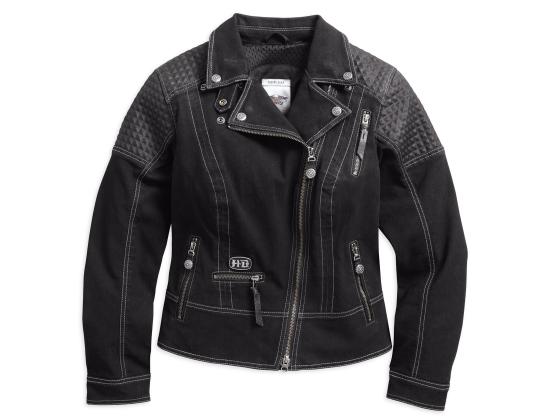 70% Baumwolle, 2% Spandex-Denim mit Polypropylen-Beschichtung. Polyester Mesh Body Futter und Polyester Taft Ärmel Futter. Zwei hintere Austrittsöffnungen und zwei Seitenschlitze. Protektorentaschen an Ellbogen, Schultern und Rücken. Snap-Down Biker-Kragen. Leicht vorgewölbte Ärmel und Taillenbund. Eine vertikale Reißverschluss Innentasche. Gestickte Grafik auf der Rückseite.