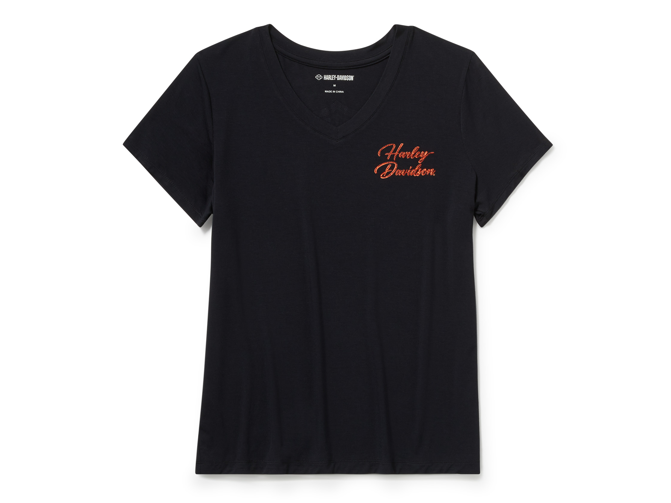 Bring deine T-Shirt-Kollektion auf ein neues Level mit unserem Essential Bling T-Shirt mit V-Ausschnitt. Der Rayon-Jersey ist superweich und leicht und hat einen Schuss Elastan für mehr Stretch. Dieses kurzärmelige Shirt für Damen hat einen coolen V-Ausschnitt und Strass-Grafiken für einen echten Harley-Davidson Look.