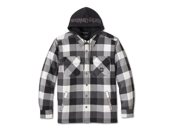 Die Traveler Hemdjacke mit Kapuze verleiht dem altbewährten Karomuster zusätzliche Wärme und ein Harley-Upgrade. Sie ist aus robustem, gebürstetem Twill aus Baumwolle gefertigt und mit einem kuscheligen Sherpa-Futter aus Polyester sowie leicht isolierten Ärmeln ausgestattet. Diese Herrenjacke mit Druckknopfleiste bietet reichlich Platz in den Taschen für wichtige Utensilien und besitzt Kragen mit versteckten Druckknöpfen, der beim Fahren unter der Motorradbekleidung an seinem Platz bleibt. Das Büffelkaro-Muster der Jacke ist mit unserem gewebten Etikett gebrandet, während die Kapuze eine hübsches Stickmotiv aufweist. Tatsächlich ist das Motiv auf der Kapuze dem Schriftzug auf unseren Baja-Rennuniformen aus den 1970er Jahren nachempfunden.