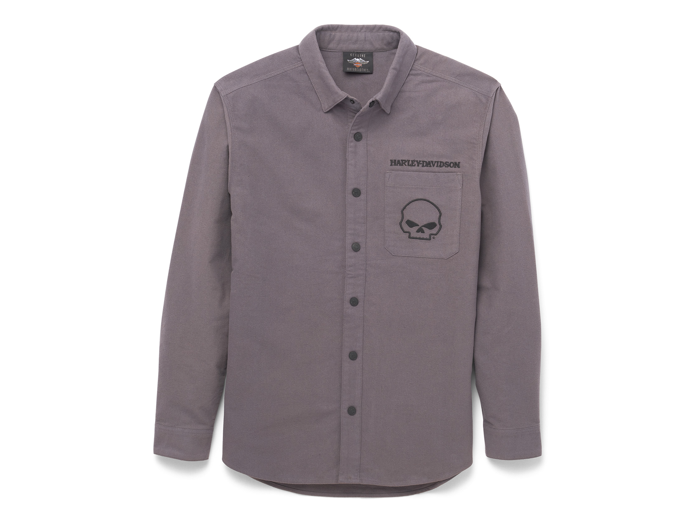Peppen Sie Ihre Garderobe mit einem vielseitigen Original von Enthusiasten auf. Dieses unifarbene Langarmhemd ist aus weichem und dennoch strapazierfähigem Baumwoll-Moleskin mit verstärkten, dreifach genähten Nähten für zusätzliche Haltbarkeit gefertigt. Es verfügt über Druckknöpfe an der Knopfleiste und den verstellbaren Ärmelbündchen sowie einen versteckten Druckknopfkragen, der auch unter der Motorradbekleidung nicht verrutscht. Mit gesticktem Namenszug und der ikonischen Grafik von Willie G. Davidson aus dem Jahr 2000 auf der Tasche.